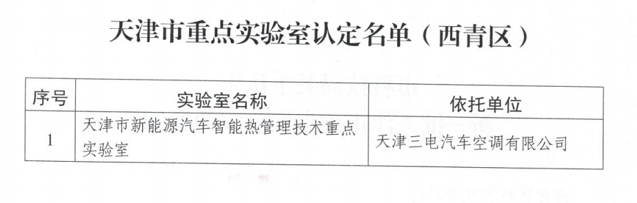 近日,天津市科技局正式公布新一批市级重点实验室认定名单,西青区企业天津三电汽车空调有限公司的“天津市新能源汽车智能热管理技术重点实验室”被成功认定为天津市重点实验室。全区市级重点实验室规模持续扩大。